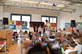Während die Jury tagte und das Publikum gespannt auf die Entscheidungen wartete, boten die Klassen 5a und 5g auch in diesem Jahr ein buntes Rahmenprogramm mit Liedbeiträgen, dem Sandwich-Rap und einem Sockentheater, das bei unseren Gästen, den Elternvertreterinnen, den Mitarbeiterinnen im Ganztag und der Klasse 3b der Grundschule Wendelstein, großen Gefallen fand und mit reichlich Applaus bedacht wurde. Das gemeinsame Singen weihnachtlicher Lieder rundete das Programm ab. So wurde aus dem Lesewettbewerb ein gelungenes „Lesefest“, das mit einer großen Überraschung endete. Da der Wettbewerb am 06. Dezember stattfand, ließ es sich der „Nikolaus“ nicht nehmen, in die Mittelschule zu kommen und alle Mädchen und Jungen mit Süßigkeiten zu beschenken.